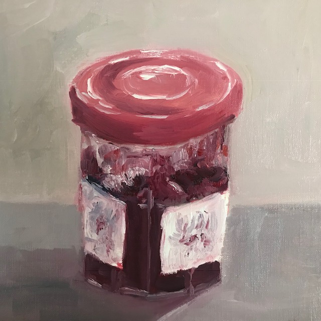Toujours dans l’idée de faire un petit tableau tous les jours, j’ai peint ce pot de confiture. Le couvercle de cette marque bien connue est en vichy rouge mais je ne suis pas arrivée à le représenter…