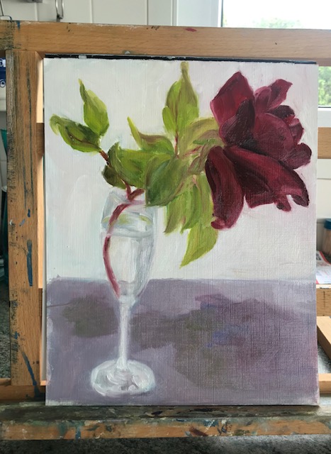 Ce matin, ce n’est pas du muguet mais une rose à peine éclose qui m’a donné envie de peindre ..
