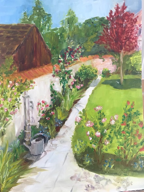 J’ai ensuite fait rapidement une esquisse sur mon papier toilé, histoire de bien mettre en place les perspectives (toujours difficile pour moi !). Enfin, j’ai placé les couleurs principales, le ciel, l’herbe, les arbres que l’on aperçoit derrière le mur du jardin. J’ai essayé de ne pas trop entrer dans les détails.
