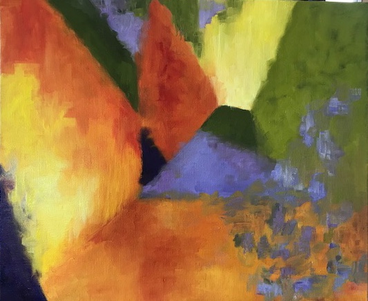 Comme toujours … même ici !… le fait de modifier un petit bout du tableau oblige à revoir l’ensemble. J’aime bien la partie gauche mais c’est vrai que orange et jaune se sont mêlés facilement. Il a fallu que je mette un peu de violet autre part dans le tableau, au début, il était à la fois trop seul et trop présent.