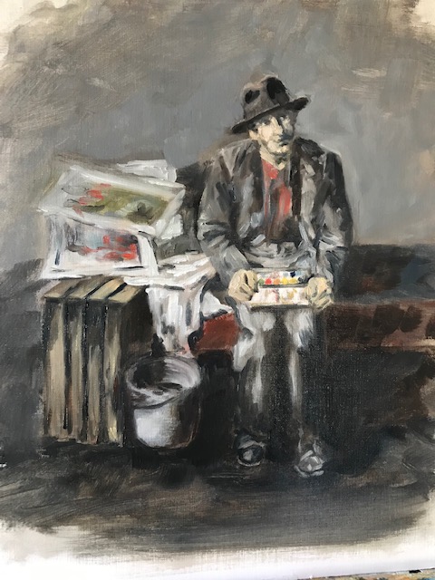 Il faut réorganiser ses journées, c’est sur avec le confinement qui va durer plus longtemps que prévu je pense! Belle scène d’un brave monsieur qui vend des peintures, beau travail Elisabeth, bonne soirée 😉 😊🖼️ 🎨