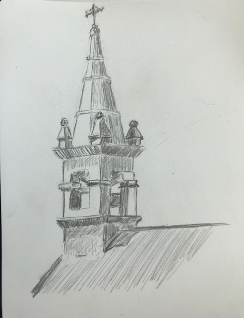 Une remarque que je me suis déjà faite à plusieurs reprises : le cadrage est à penser très soigneusement dès le début et même AVANT le début du croquis. Il faut que le dessin soit bien placé et qu’il rentre dans la feuille ! Dans mes 2 croquis, la croix surplombant le clocher a bien failli ne pas apparaître !