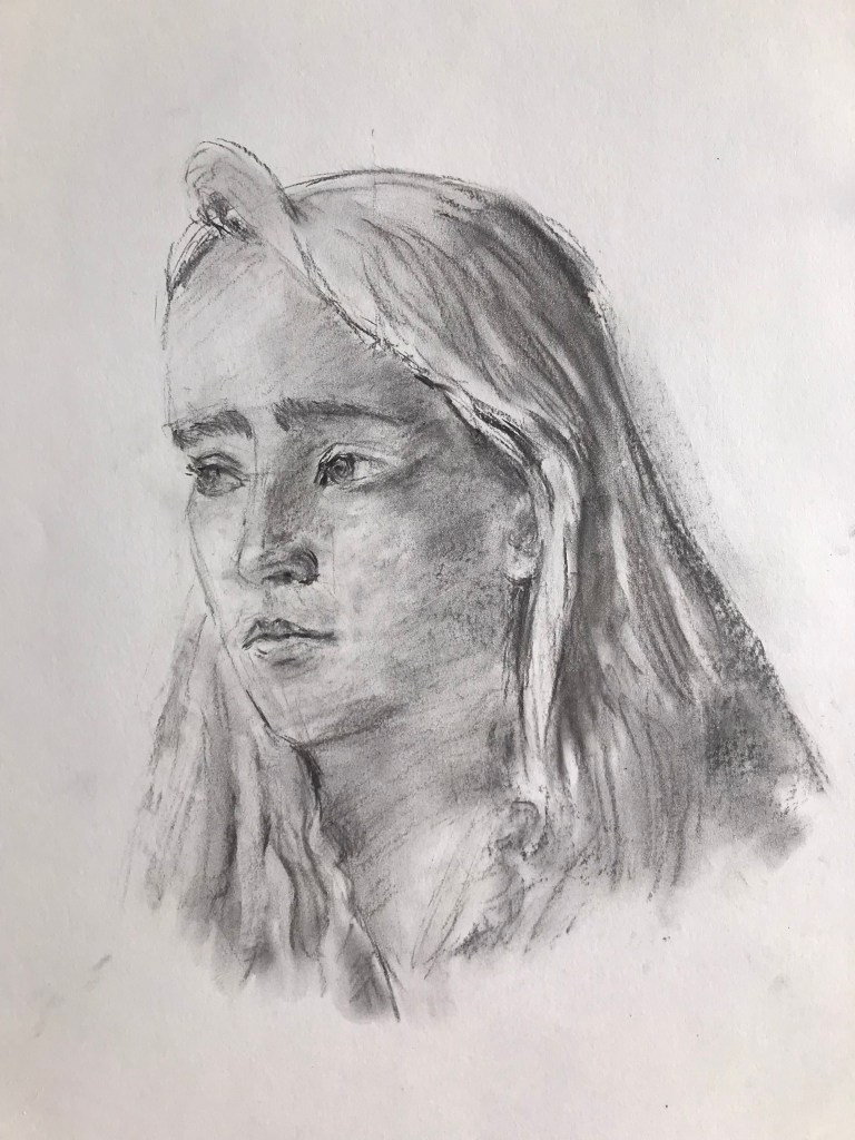 Je suis contente de mon dessin. J’ai travaillé à la verticale sur mon chevalet et non attablée comme je le fais d’habitude. Est-ce pour cela, en tout cas, je trouve que j’ai mieux respecté les proportions et qu’il y a même une certaine ressemblance …