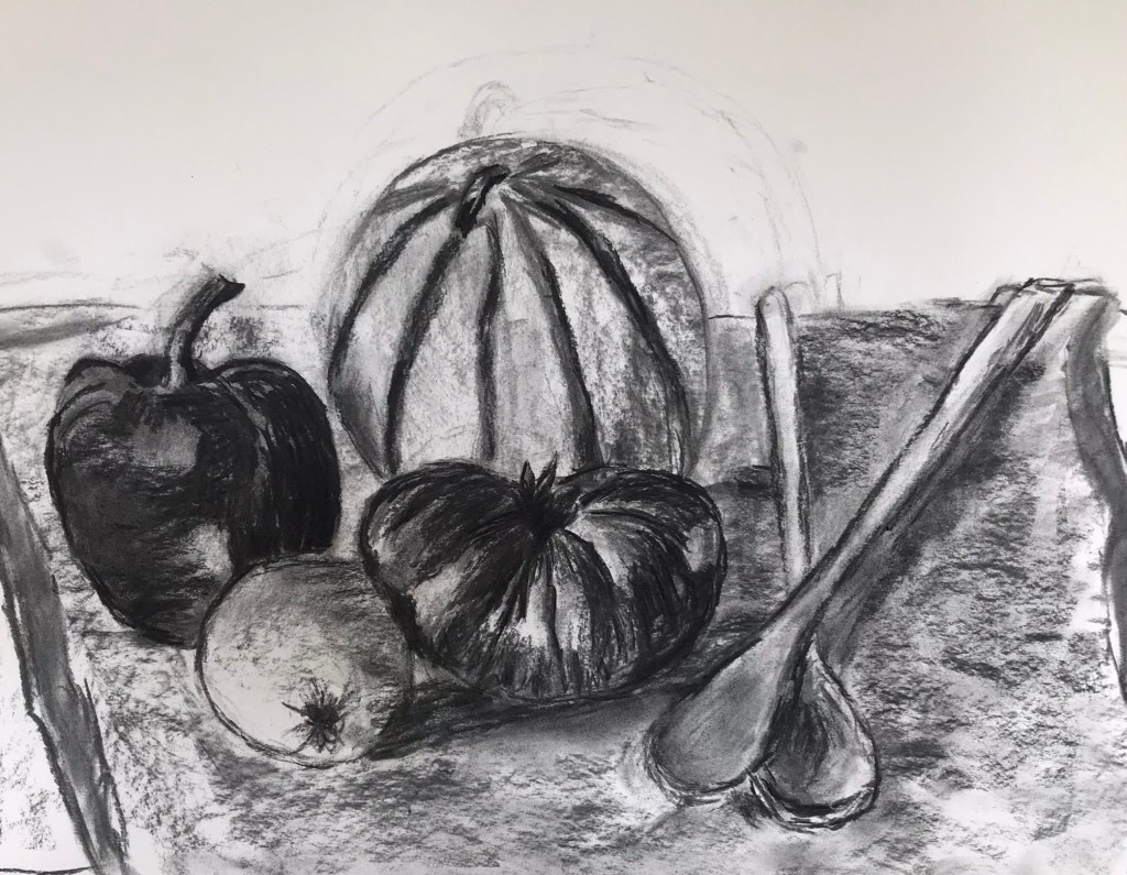 Puisque c’est la rentrée et que les carnets de voyage sont refermés pour un petit moment, voici une petite nature morte, au fusain, histoire de se remettre au travail.
