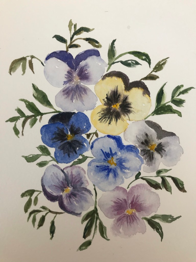 Depuis quelques jours, c’est peindre des fleurs qui m’amuse. Après les jonquilles, les anémones et les tulipes, voici quelques pensées.