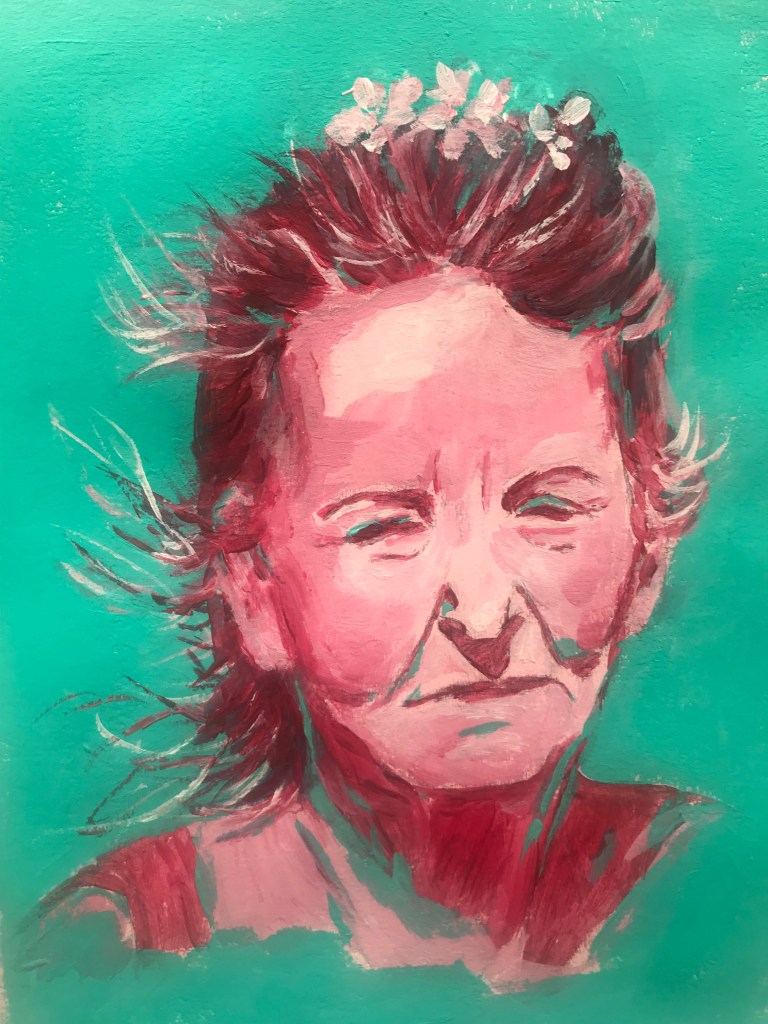 Exercice de la DrawingFactory : c’est une charmante dame, légèrement décoiffée (malgré ses fleurs dans les cheveux), qu’il fallait peindre cette semaine. Il était demandé de traiter l’exercice en violet sur fond jaune.