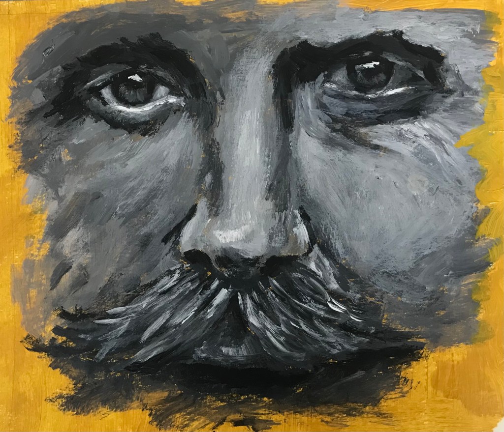 Fond à l’acrylique ocre jaune puis travail en différents gris sans dessin préalable. Maintenant qu’il est fait, je trouve que l’ombre sous l’œil droit est trop sombre.