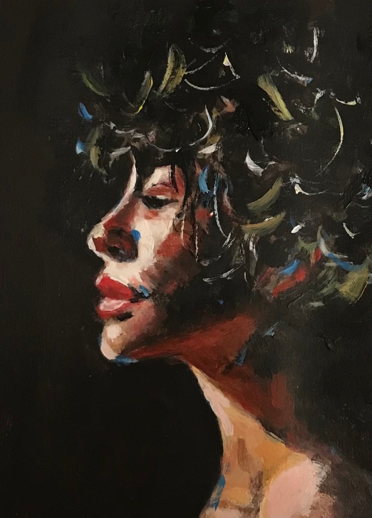 Une jeune fille échevelée … encore un portrait à contrejour, petit nez retroussé et lèvres rouges. Fait à l’acrylique (exercice de la DrawingFactory).