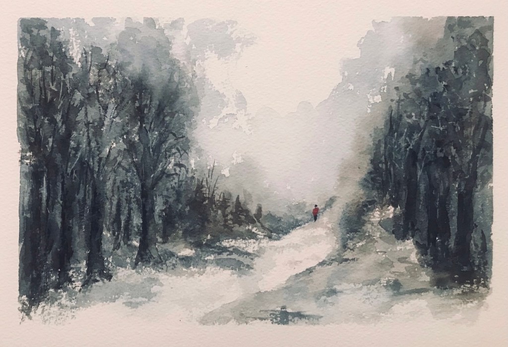 Dehors, le ciel était gris, il pleuvait, j’étais fatiguée, l’aquarelle me paraissait le médium le plus adéquat pour peindre sans sortir trop de matériel.