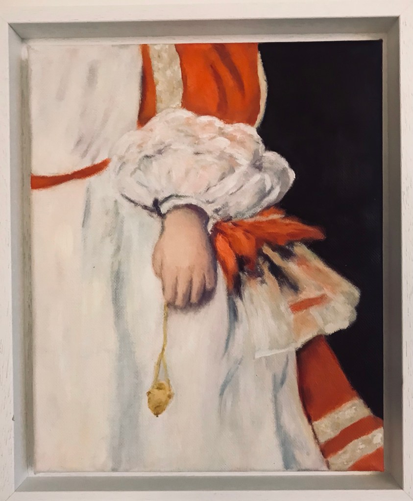 Je me suis inspirée du portrait du jeune Philippe Prosper peint par Velasquez. Une petite main qui tient un hochet … voilà qui m’a paru tout à fait approprié !